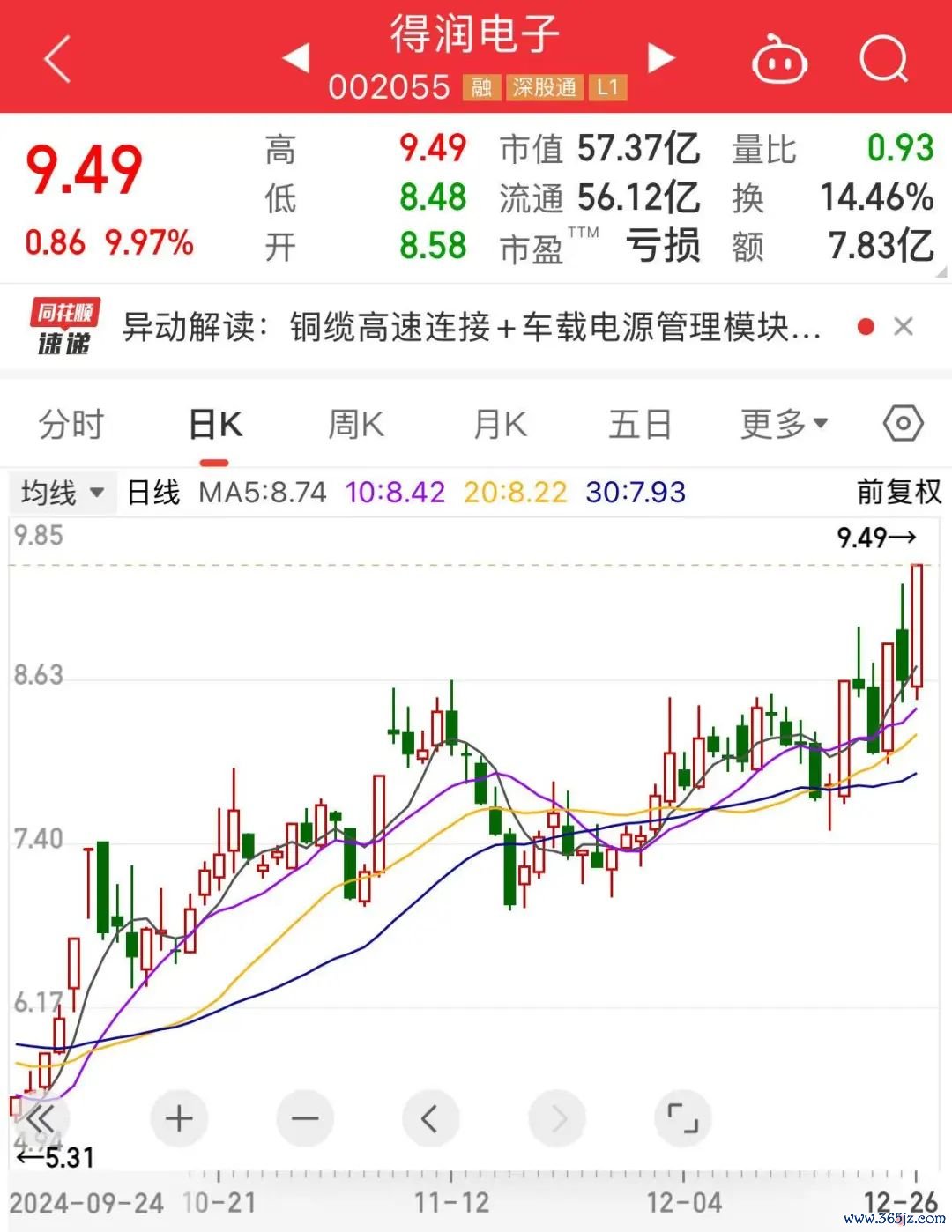 近日,在铜缆高速连接板块的持续火热背景下,得润电子股价持续攀升,12月以来股价累计上涨27.21%。昨日该股以涨停收盘,最新股价报9.49元/股。