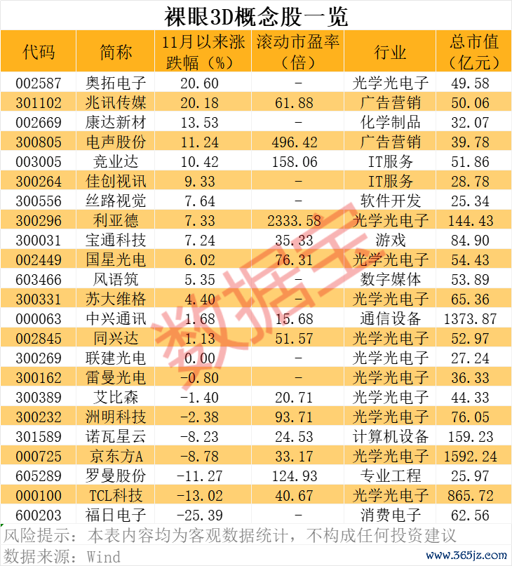 据证券时报·数据宝统计,布局裸眼3D的A股上市公司共有23家,主要荟萃在光学光电子行业,其他还有告白营销、数字媒体等行业上市公司。从股价上来看,成见股11月以来平均高潮2.38%,其中奥拓电子、兆讯传媒、康达新材、电声股份、竞业达累计涨幅特出10%。